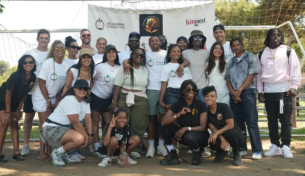Jamaican actress/philantropist Keturah Hamilton (front row, in black gear and glasses) teamed with actor Malcolm Mays (center, second row) on July 29 to donate back-to-school items to students in his Los Angeles neighborhood. The event was staged by her Keturah Hamilton Foundation and his Ceola Marie Foundation. Items were donated by the Kinnect Foundation and New Balance.